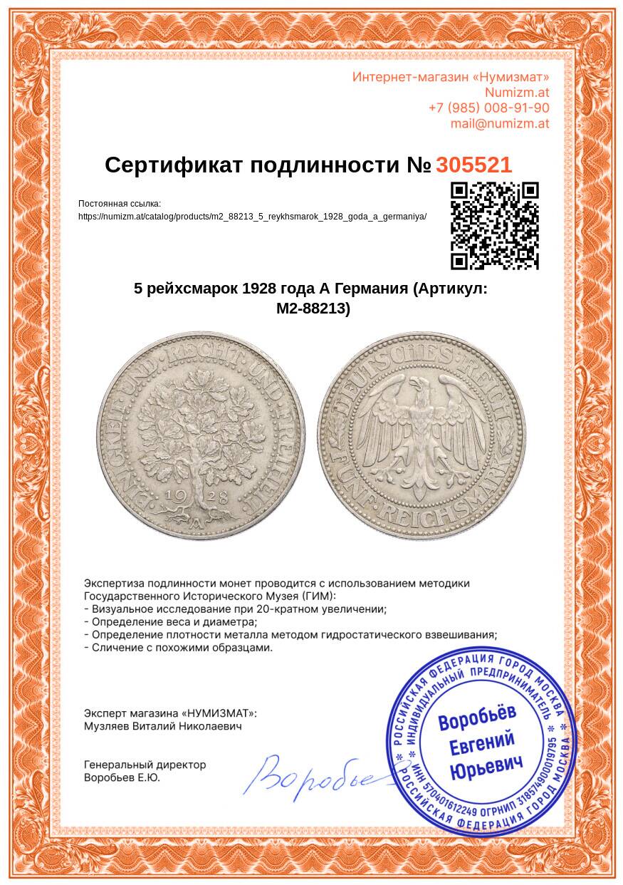 20.01.2025Интернет магазин «Нумизмат» предлагает приобрести 5 рейхсмарок 1928 года А Германия.