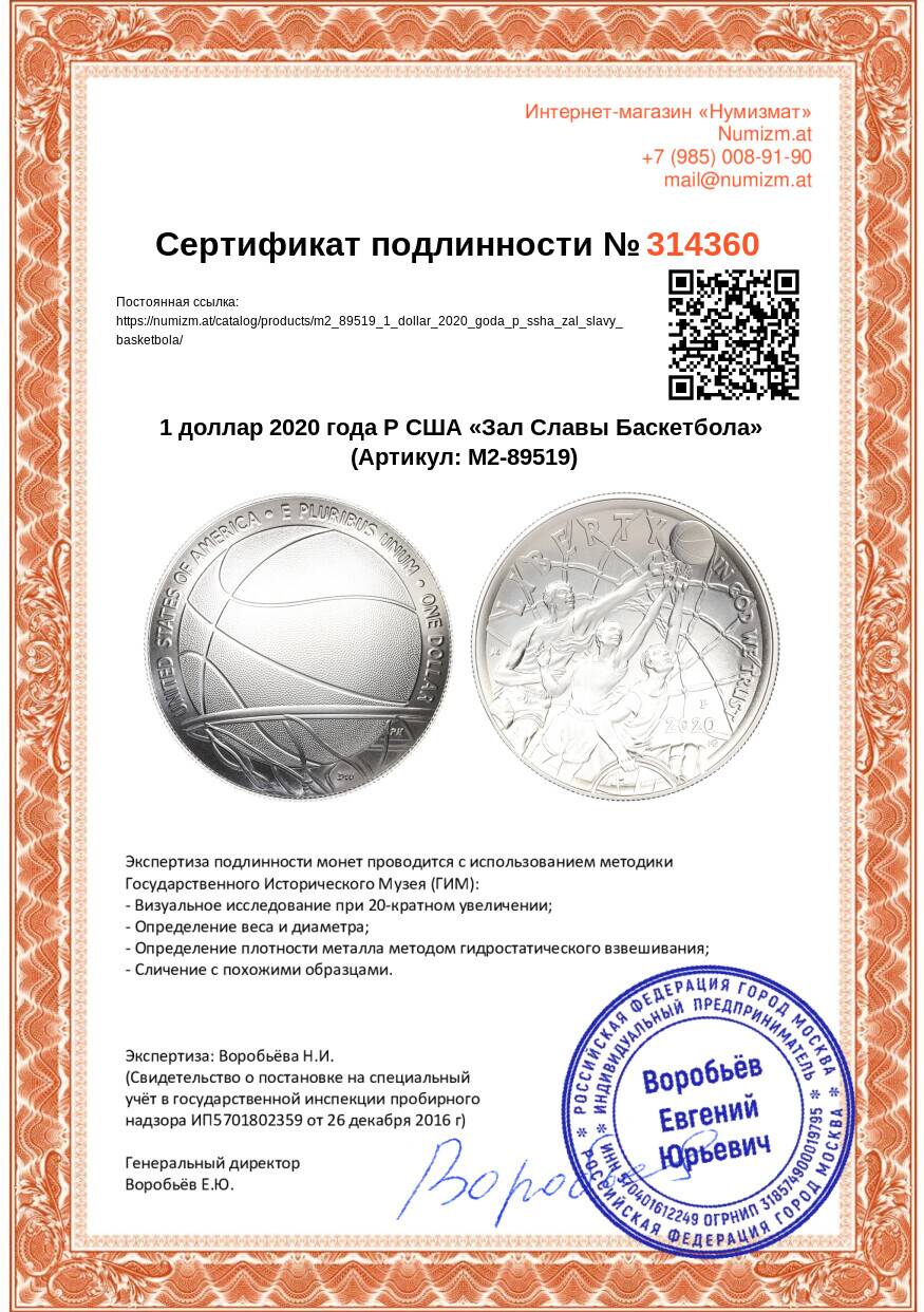 20.01.2025Интернет магазин «Нумизмат» предлагает приобрести 1 доллар 2020 года P США «Зал Славы Баскетбола».