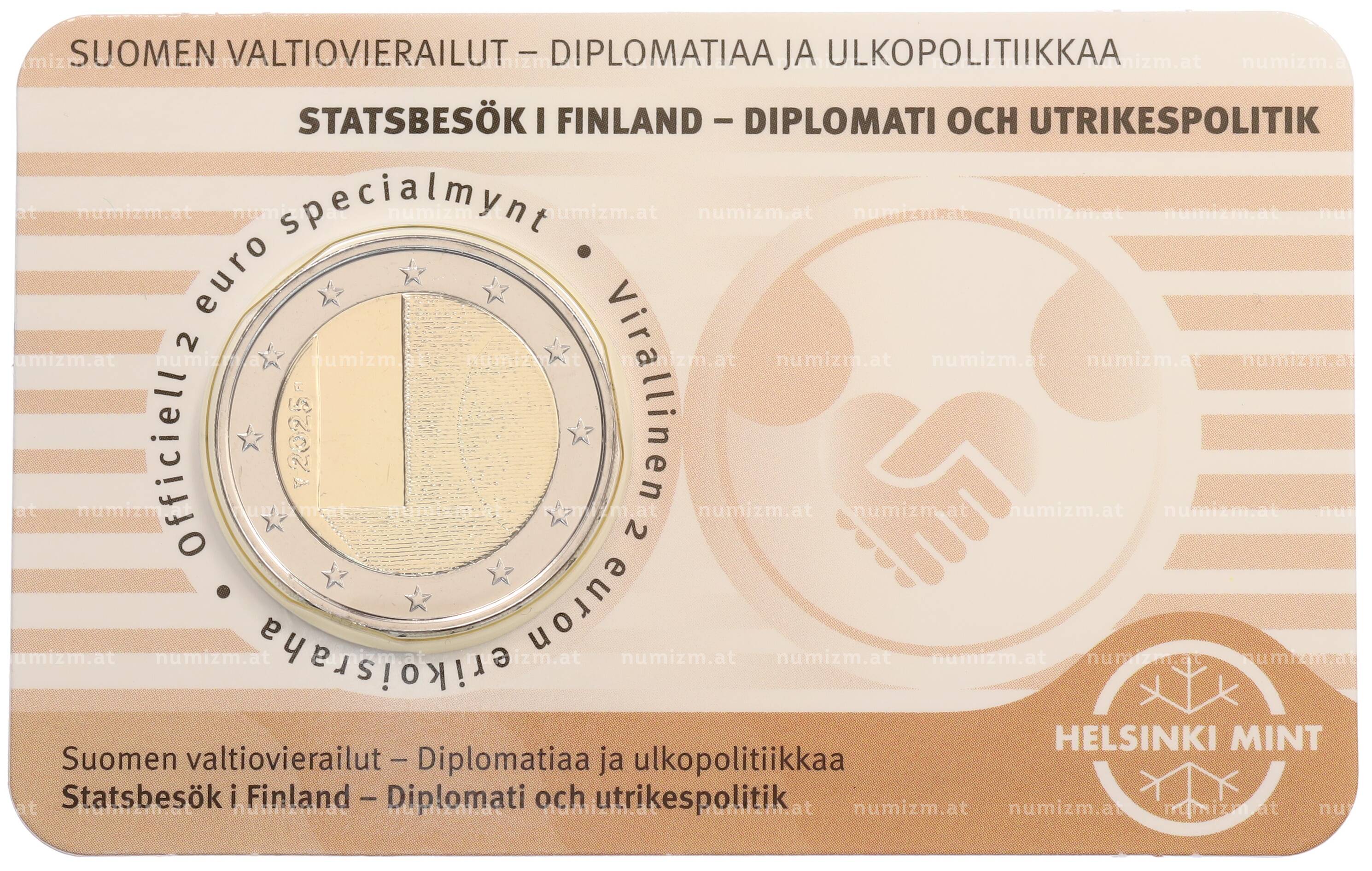 20.01.2025Интернет магазин «Нумизмат» предлагает приобрести 2 евро 2025 года Финляндия «Дипломатия и внешняя политика» (Бежевый блистер — надписи на лицевой стороне на финском).