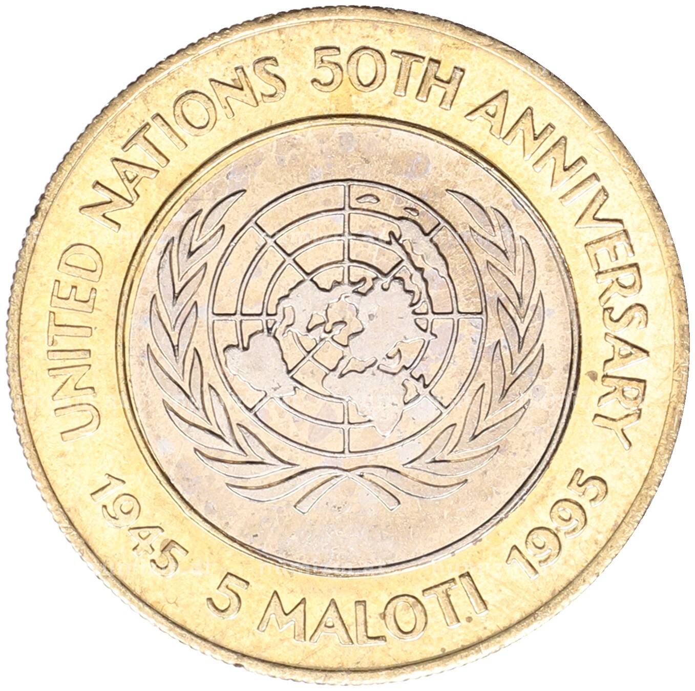 Монета 5 малоти 1995 года Лесото «50 лет ООН» (Артикул: M2-90063): подробные характеристики, качественные фотографии в высоком разрешении, низкая цена.