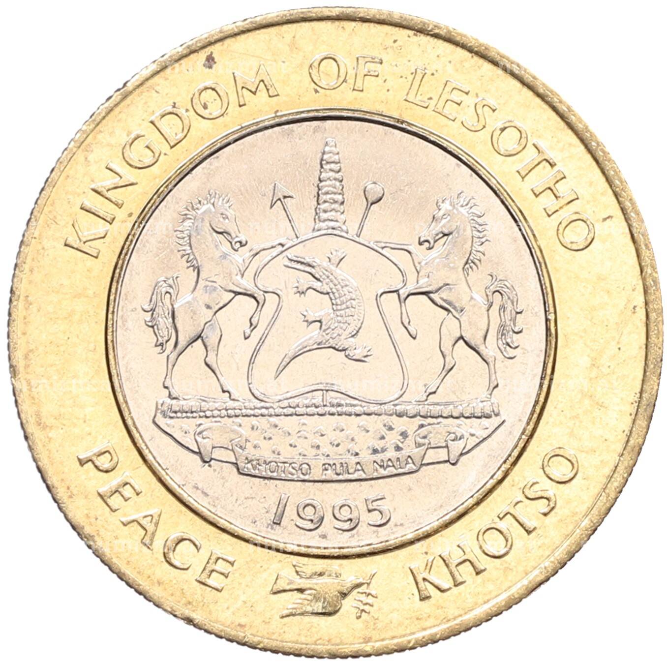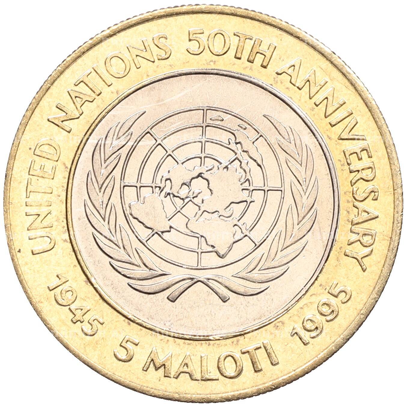 Купить 5 малоти 1995 года Лесото «50 лет ООН» по привлекательной цене можно в нашем интернет-магазине — Вам достаточно оформить заказ на сайте. Все монеты, представленные в каталоге, находятся в наличии на нашем складе.