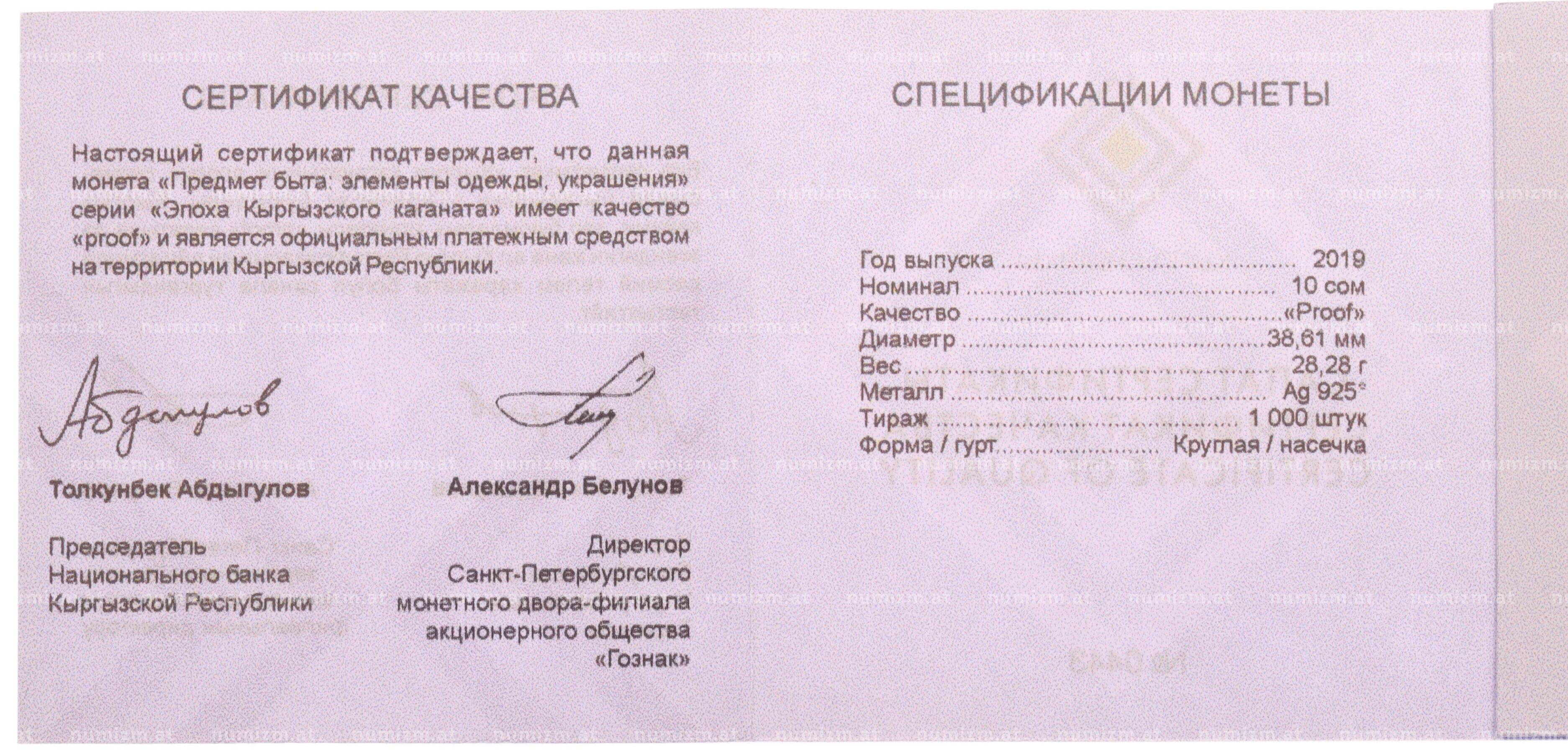 Купить 10 сом 2019 года Киргизия «Эпоха Кыргызского Каганата — Предмет быта (элементы одежды и украшения)» по привлекательной цене можно в нашем интернет-магазине — Вам достаточно оформить заказ на сайте. Все монеты, представленные в каталоге, находятся в наличии на нашем складе.