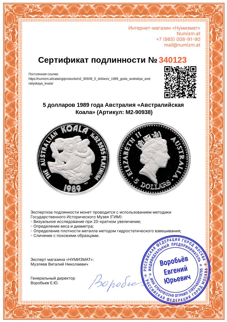 20.01.2025Интернет магазин «Нумизмат» предлагает приобрести 5 долларов 1989 года Австралия «Австралийская Коала».