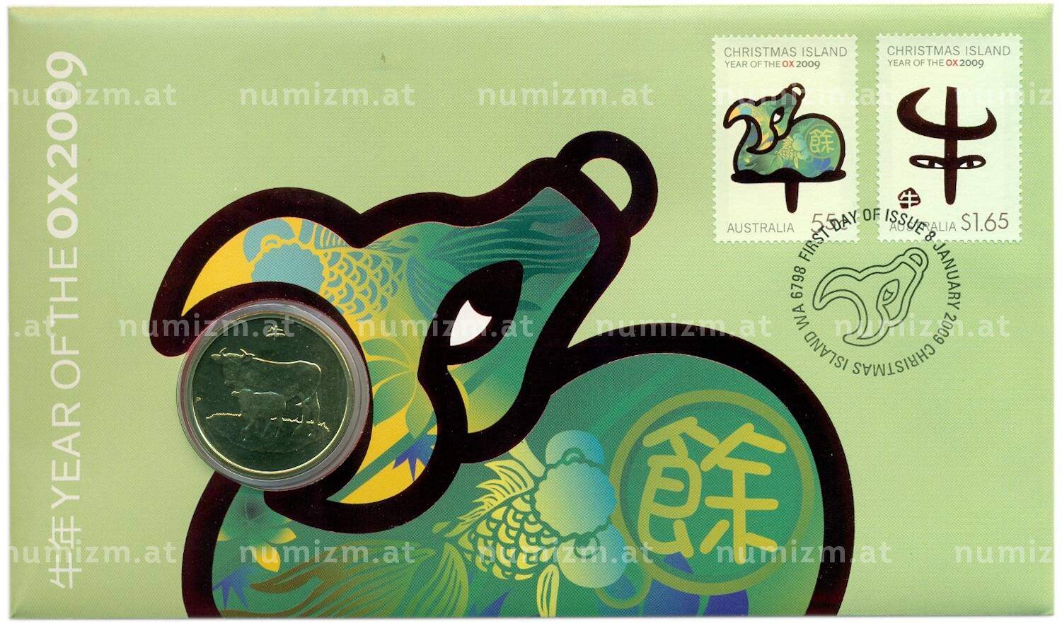 • Монета 1 доллар 2009 года Австралия «Китайский гороскоп — Год быка» (в конверте с марками) (Артикул: M2-91369)