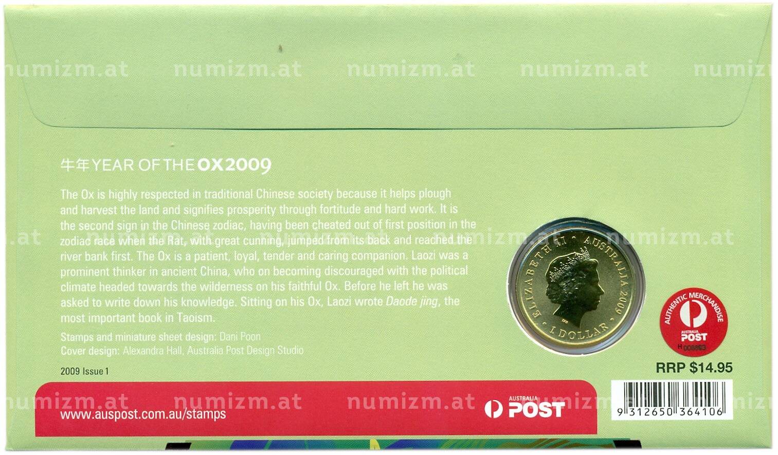 Монета 1 доллар 2009 года Австралия «Китайский гороскоп — Год быка» (в конверте с марками) (Артикул: M2-91369): подробные характеристики, качественные фотографии в высоком разрешении, низкая цена.