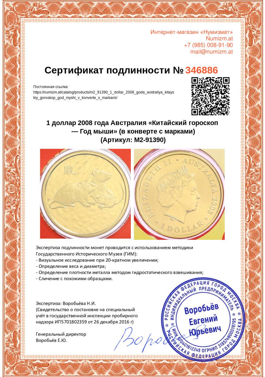 20.01.2025Интернет магазин «Нумизмат» предлагает приобрести 1 доллар 2008 года Австралия «Китайский гороскоп — Год мыши» (в конверте с марками).