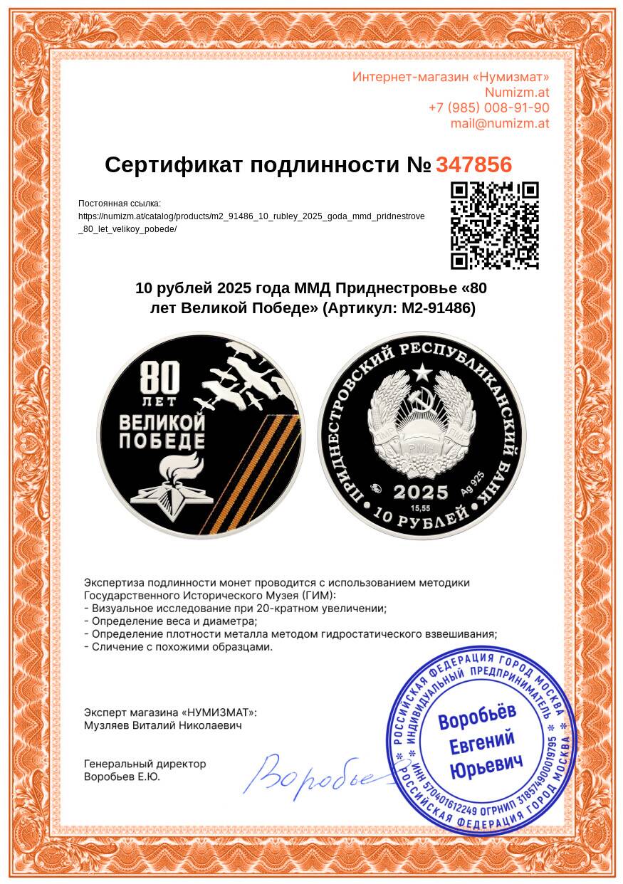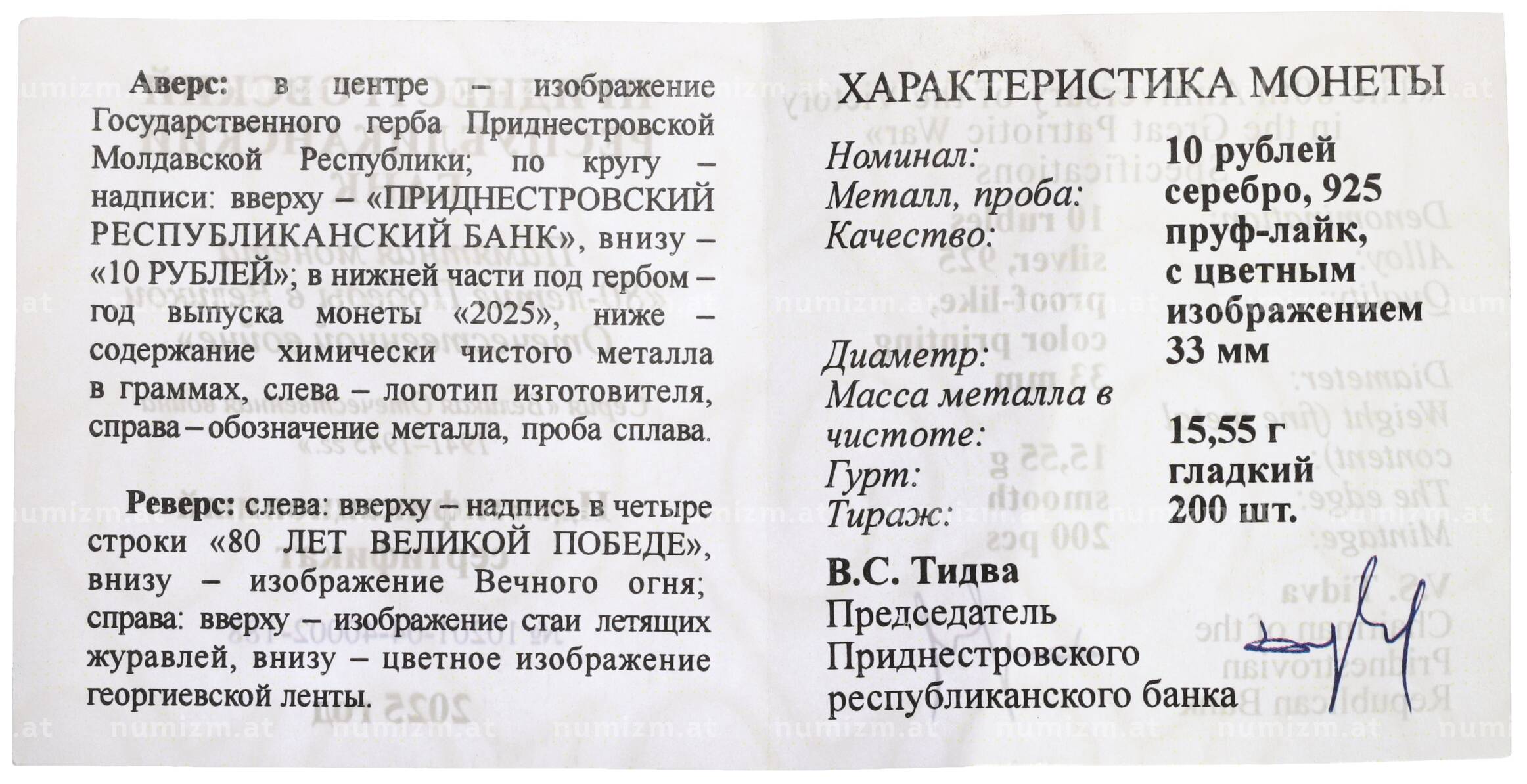 20.01.2025Интернет магазин «Нумизмат» предлагает приобрести 10 рублей 2025 года ММД Приднестровье «80 лет Великой Победе».