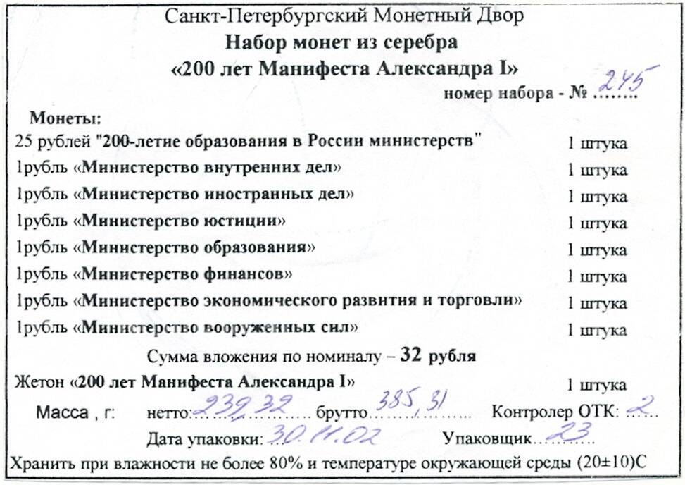 Купить Набор сербряных памятных монет 2002 года ММД «200 лет манифесту Александра I об образовании министерств» по привлекательной цене можно в нашем интернет-магазине — Вам достаточно оформить заказ на сайте. Все монеты, представленные в каталоге, находятся в наличии на нашем складе.