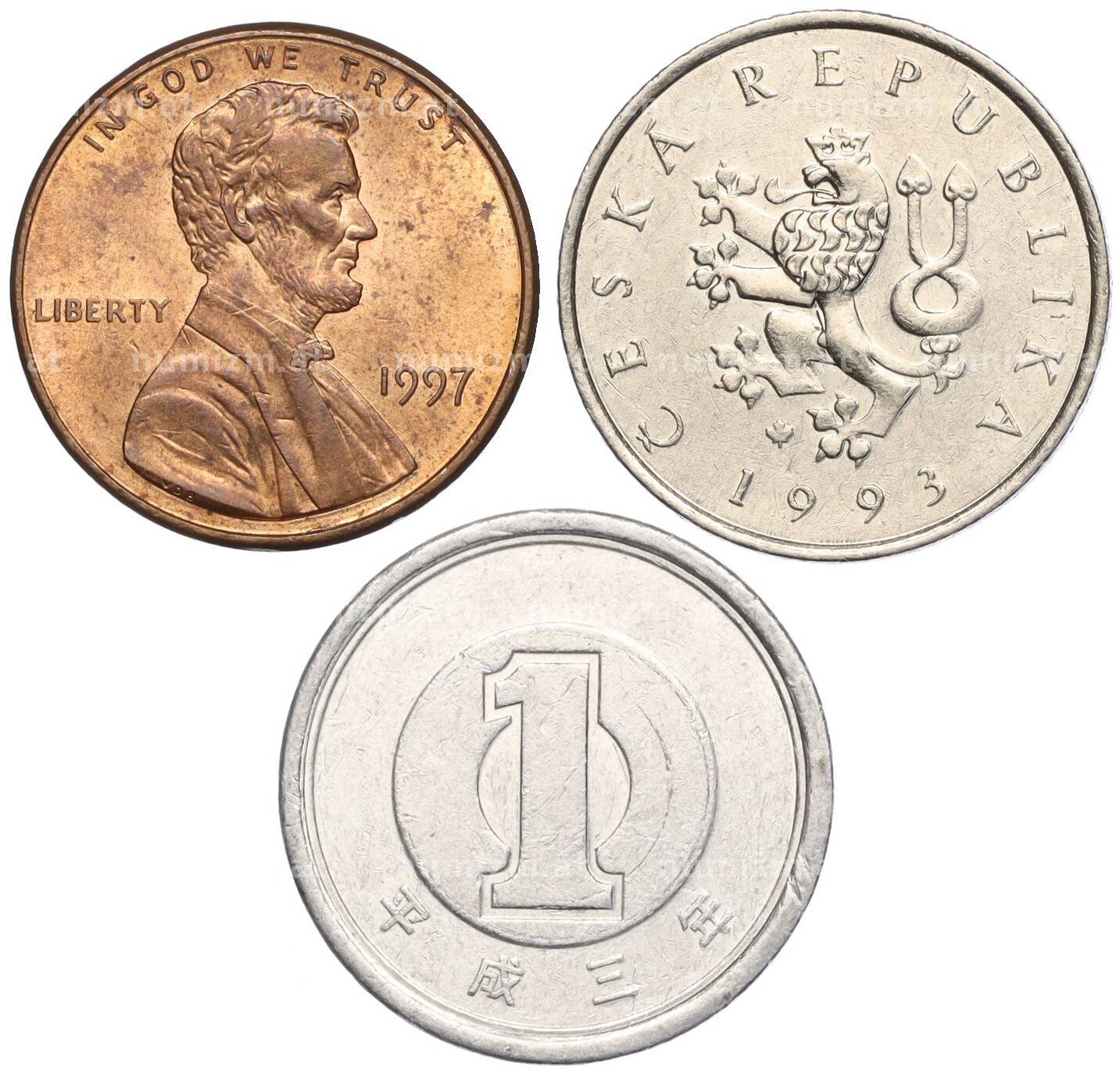 Набор из трех случайных монет разных стран мира (без России и СССР). Состояние монет не ниже VF.