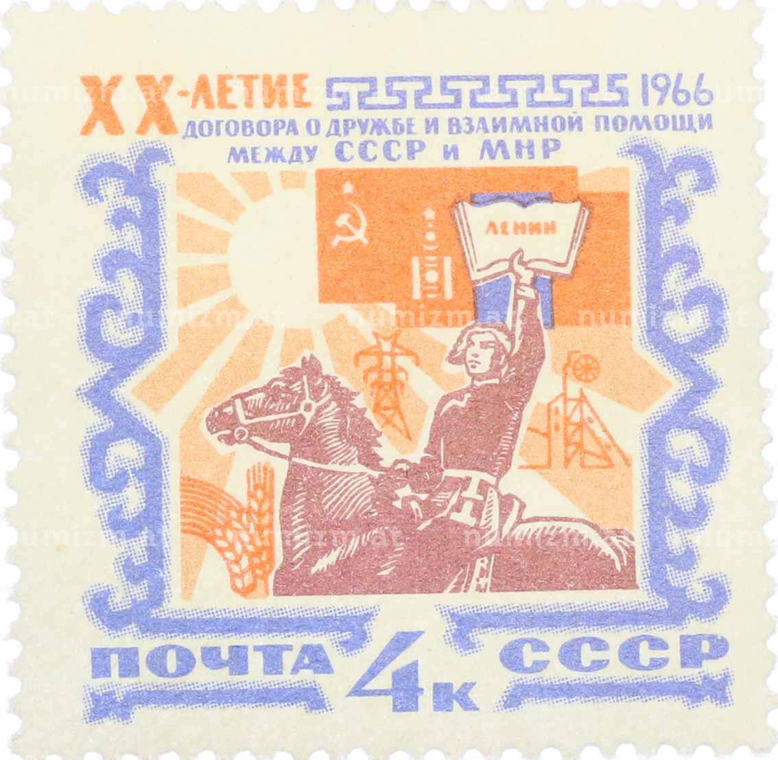 Купить Почтовая марка 4 копейки 1966 года «20 лет Договору о дружбе и взаимной помощи между СССР и МНР» по привлекательной цене можно в нашем интернет-магазине — Вам достаточно оформить заказ на сайте. Все монеты, представленные в каталоге, находятся в наличии на нашем складе.