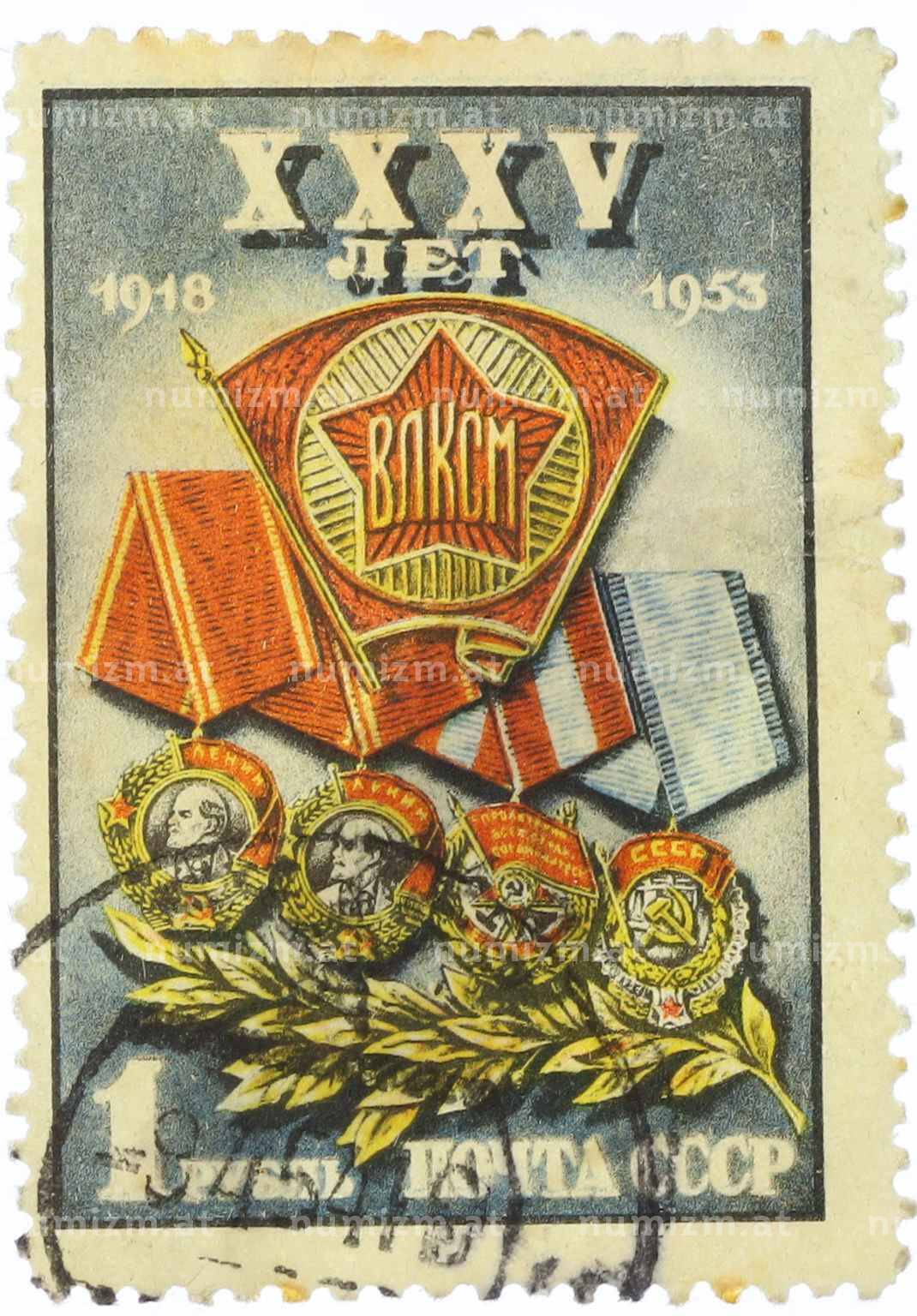 Купить Почтовая марка 1 рубль 1953 года «35 лет ВЛКСМ» по привлекательной цене можно в нашем интернет-магазине — Вам достаточно оформить заказ на сайте. Все монеты, представленные в каталоге, находятся в наличии на нашем складе.