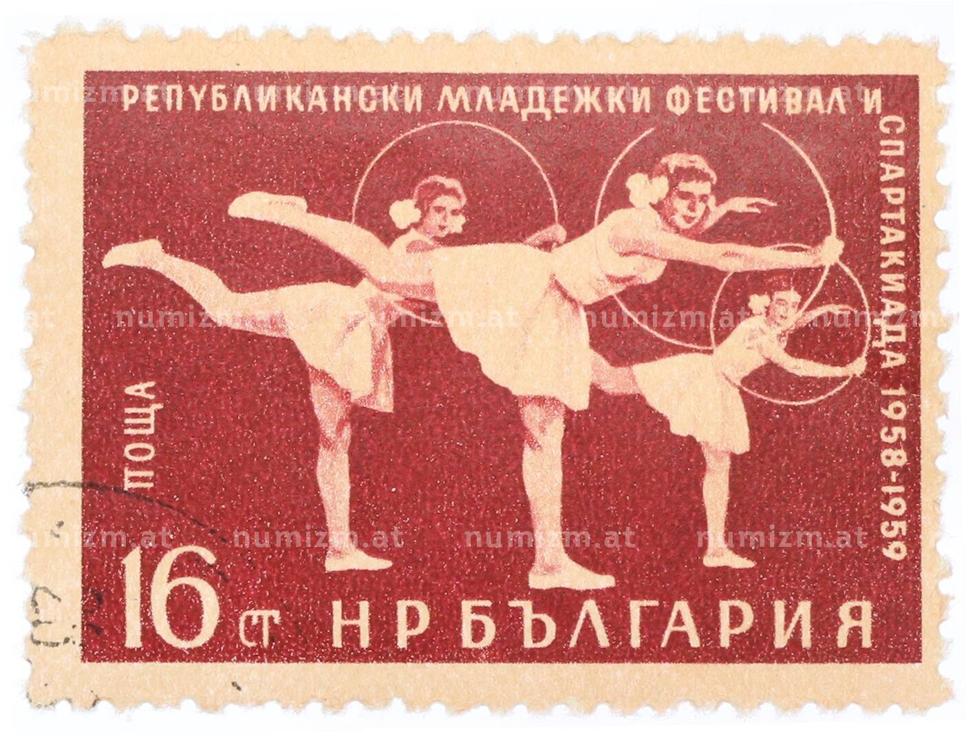 20.01.2025Интернет магазин «Нумизмат» предлагает приобрести Почтовая марка 16 стотинок 1959 года Болгария «7-й Международный молодежный фестиваль в Вене — Гимнастика с обручем».