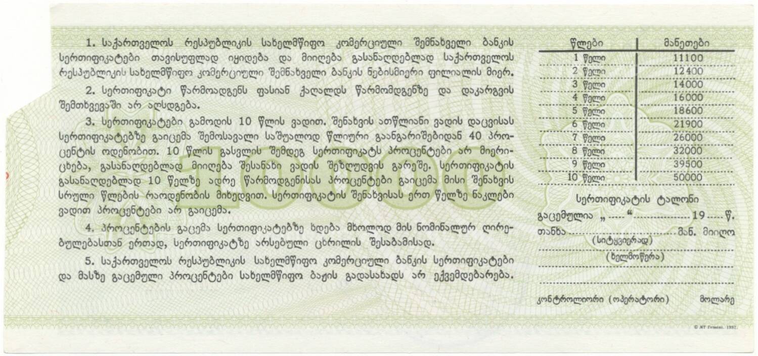 20.01.2025Интернет магазин «Нумизмат» предлагает приобрести Сберегательный сертификат 10000 рублей 1992 года Грузия.