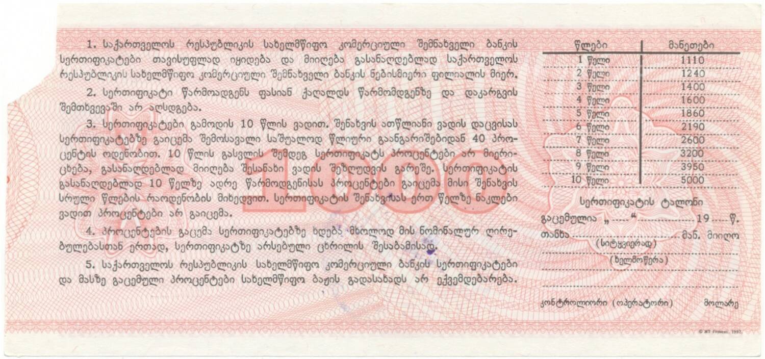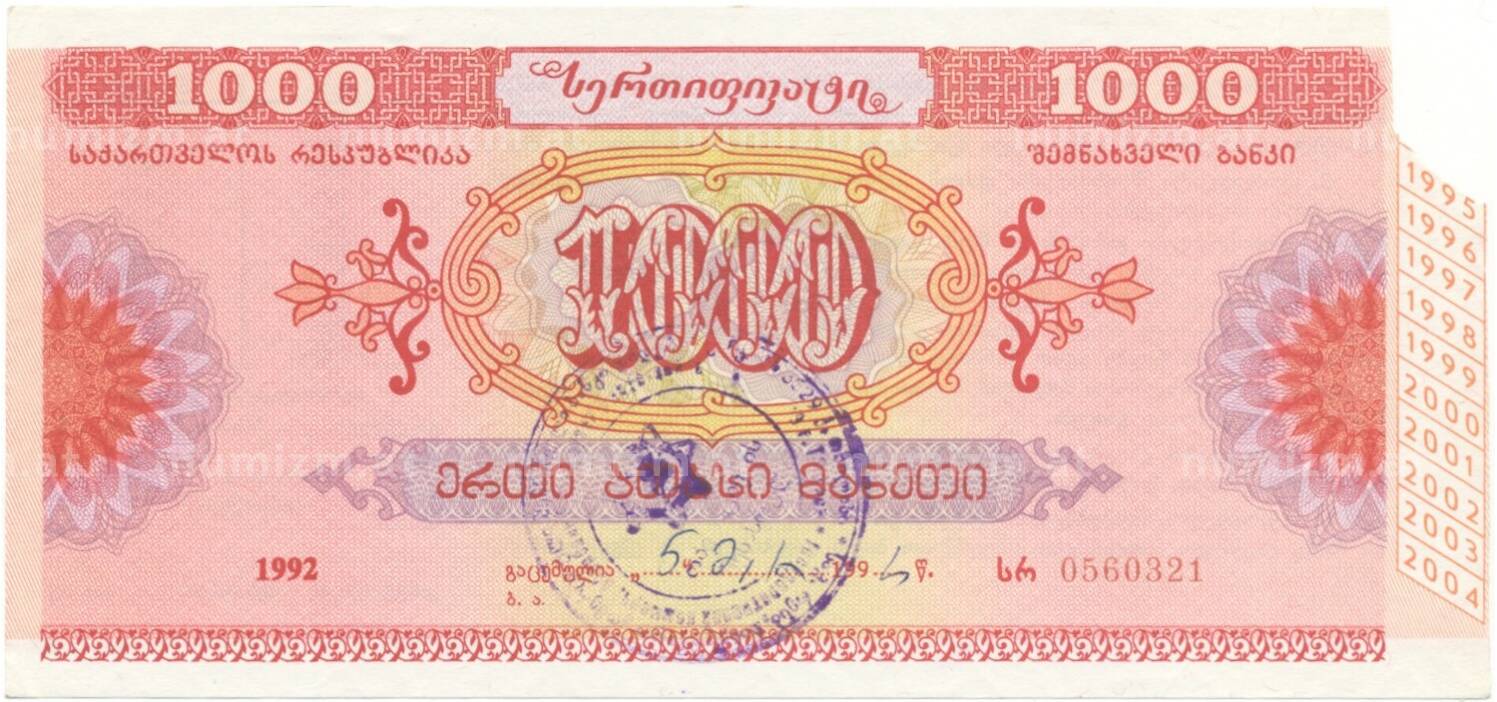 20.01.2025Интернет магазин «Нумизмат» предлагает приобрести Сберегательный сертификат 1000 рублей 1992 года Грузия.
