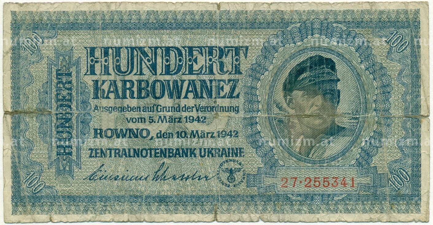 20.01.2025Интернет магазин «Нумизмат» предлагает приобрести 100 карбованцев 1942 года Германская оккупация Украины (город Ровно).