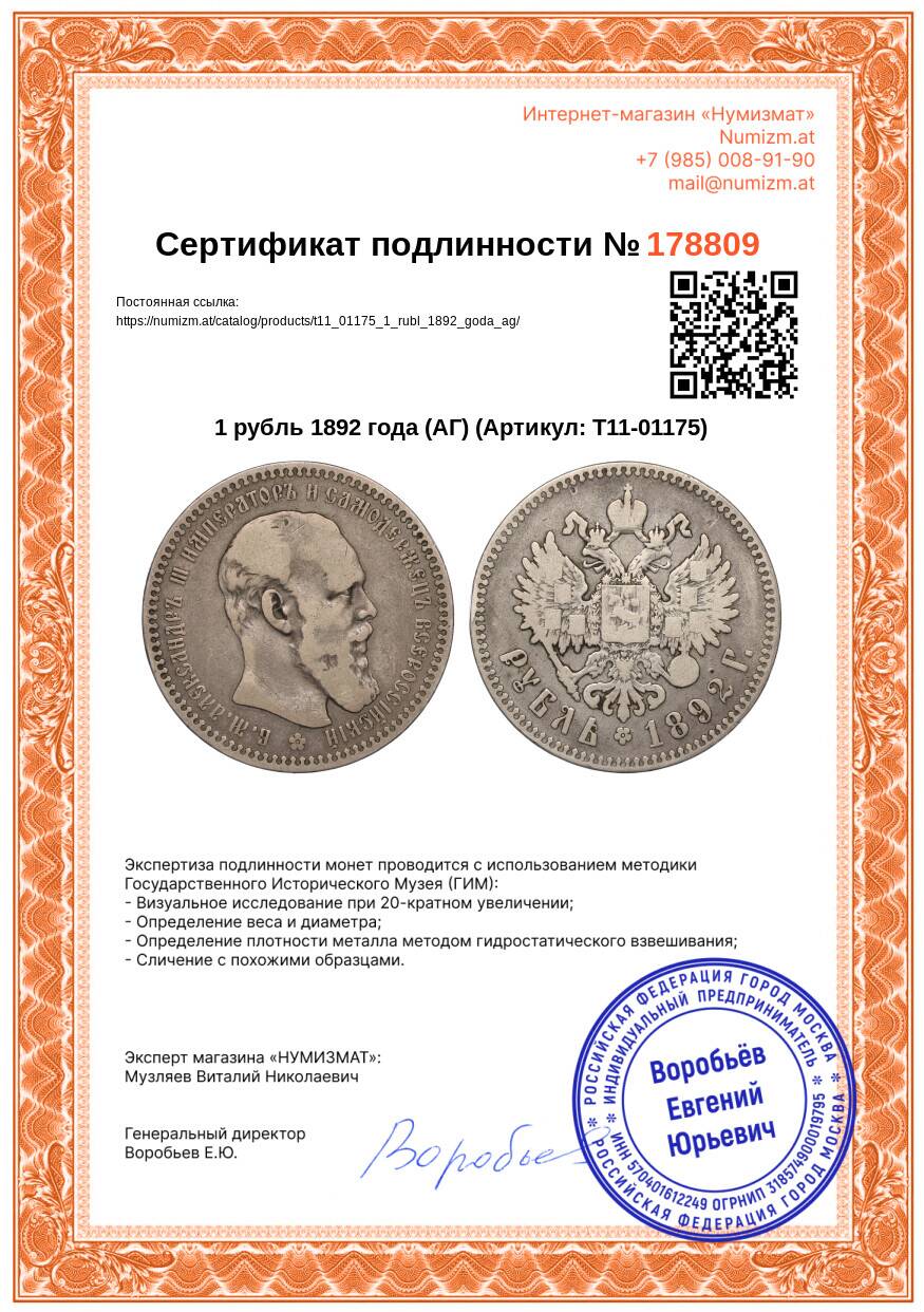 Купить 1 рубль 1892 года (АГ) по привлекательной цене можно в нашем интернет-магазине — Вам достаточно оформить заказ на сайте. Все монеты, представленные в каталоге, находятся в наличии на нашем складе.