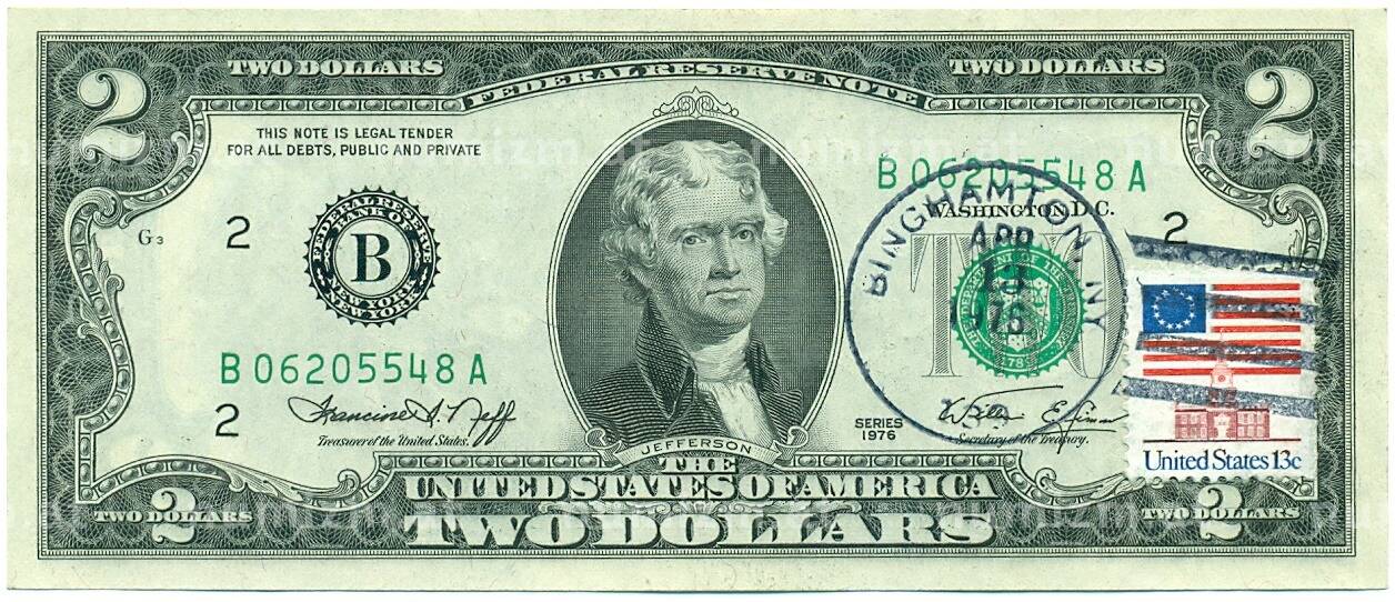 Оригианальная банкнота 2 доллара 1976 года с наклеенной почтовой маркой и почтовым штемпелем города Бингемтон от 13 апреля 1976 года.