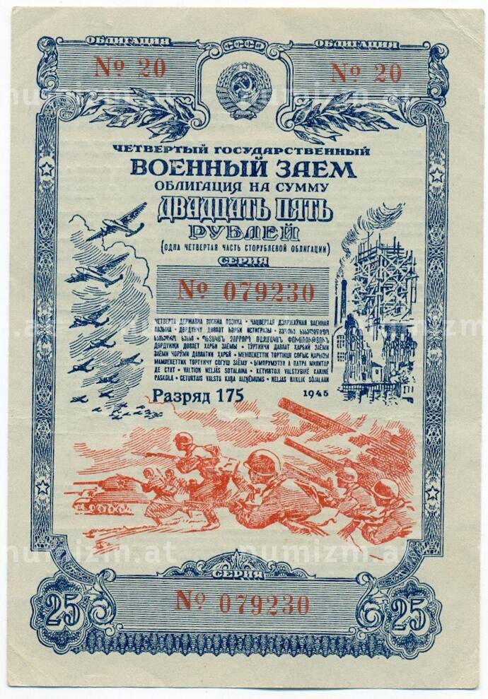 Купить Облигация военного госзайма 25 рублей 1945 года по привлекательной цене можно в нашем интернет-магазине — Вам достаточно оформить заказ на сайте. Все монеты, представленные в каталоге, находятся в наличии на нашем складе.