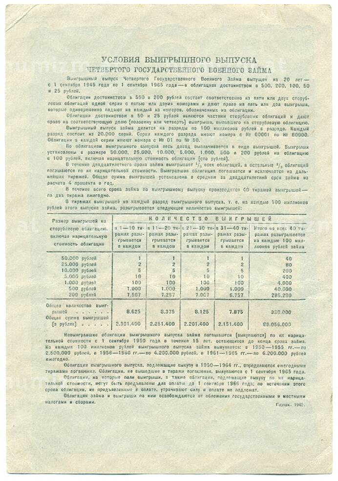 20.01.2025Интернет магазин «Нумизмат» предлагает приобрести Облигация военного госзайма 25 рублей 1945 года.