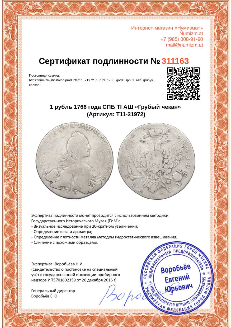 Купить 1 рубль 1766 года СПБ ТI АШ «Грубый чекан» по привлекательной цене можно в нашем интернет-магазине — Вам достаточно оформить заказ на сайте. Все монеты, представленные в каталоге, находятся в наличии на нашем складе.