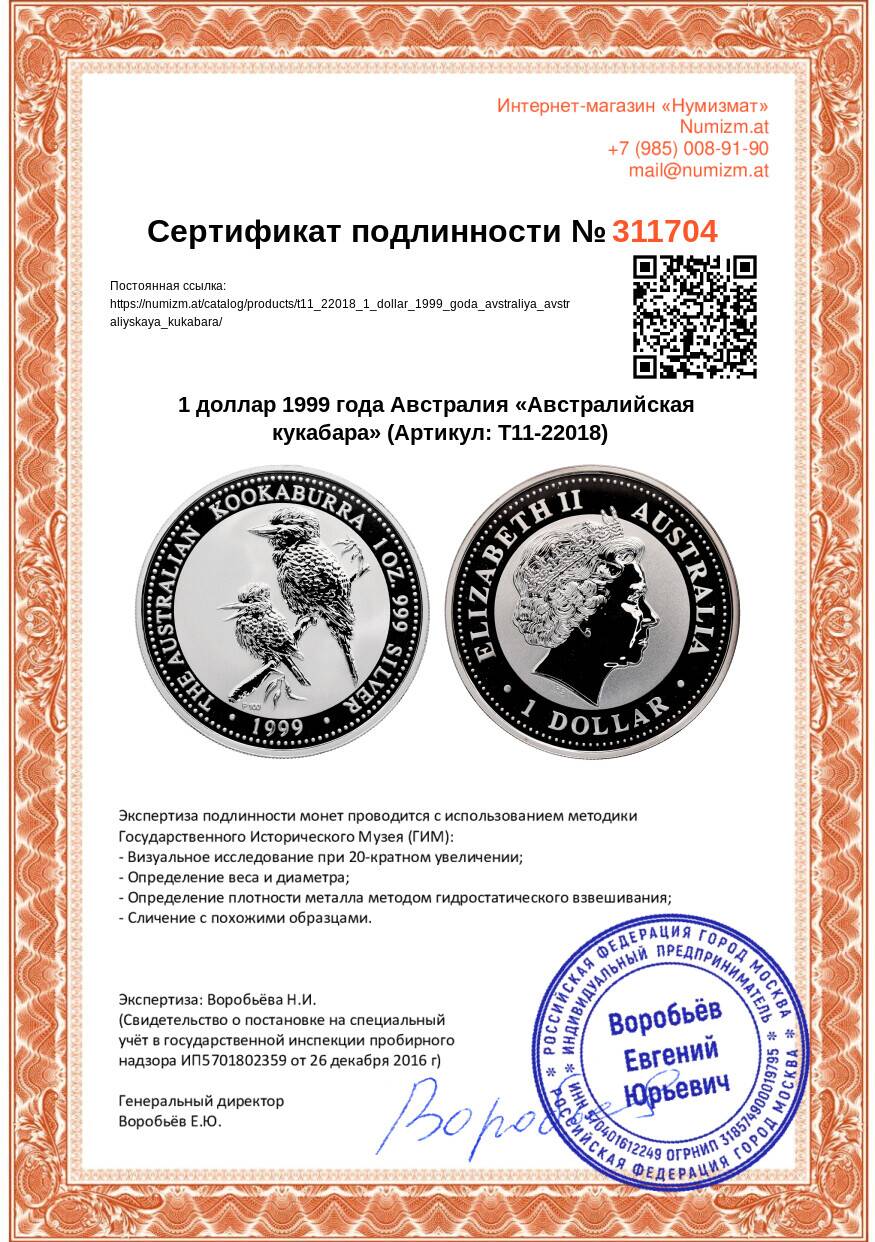20.01.2025Интернет магазин «Нумизмат» предлагает приобрести 1 доллар 1999 года Австралия «Австралийская кукабара».