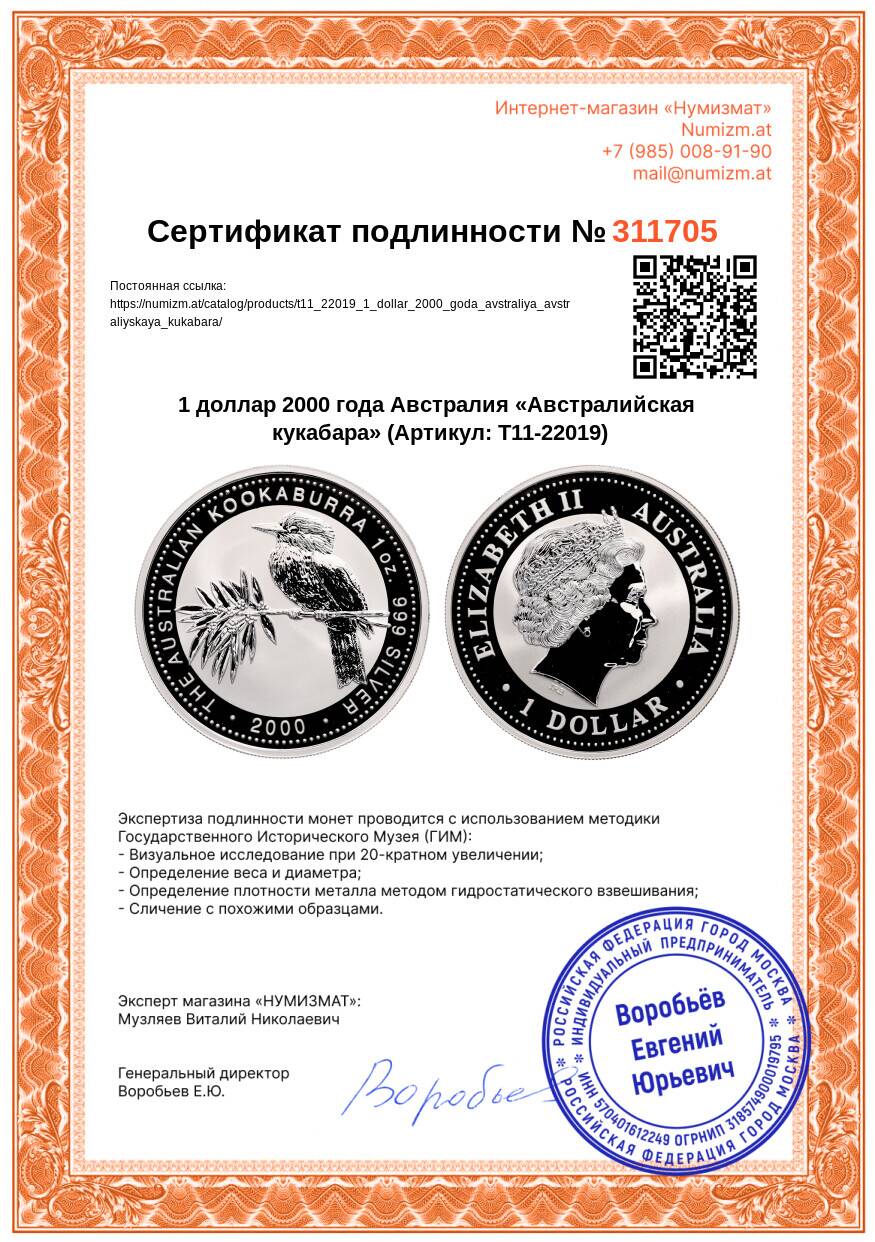 20.01.2025Интернет магазин «Нумизмат» предлагает приобрести 1 доллар 2000 года Австралия «Австралийская кукабара».