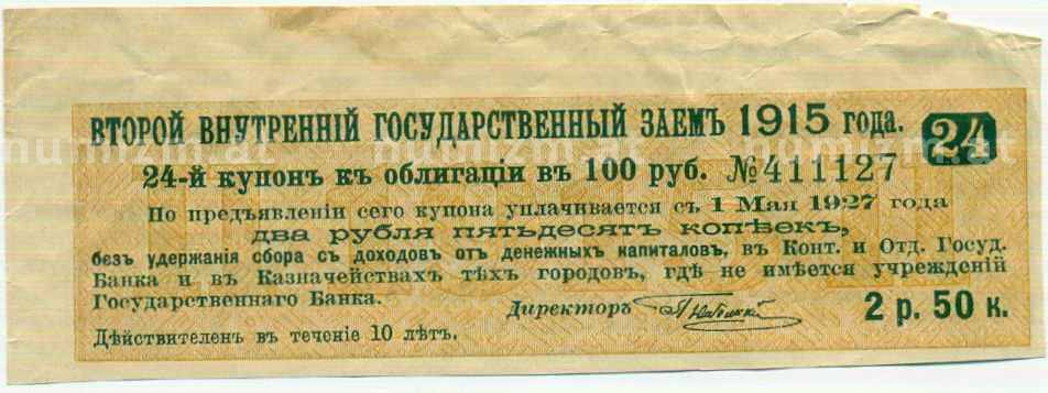 20.01.2025Интернет магазин «Нумизмат» предлагает приобрести Купон от облигации 100 рублей 1915 года «Второй внутренний государственный заем».