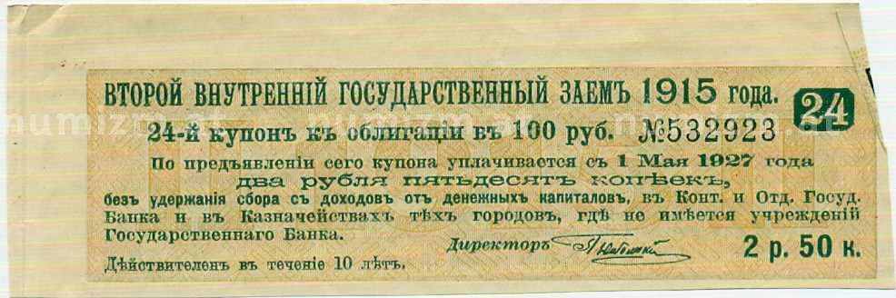 20.01.2025Интернет магазин «Нумизмат» предлагает приобрести Купон от облигации 100 рублей 1915 года «Второй внутренний государственный заем».