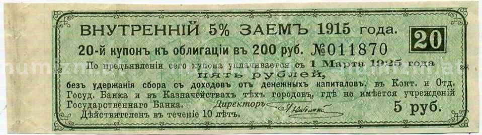 20.01.2025Интернет магазин «Нумизмат» предлагает приобрести Купон от облигации 200 рублей 1915 года «Внутренний заем».
