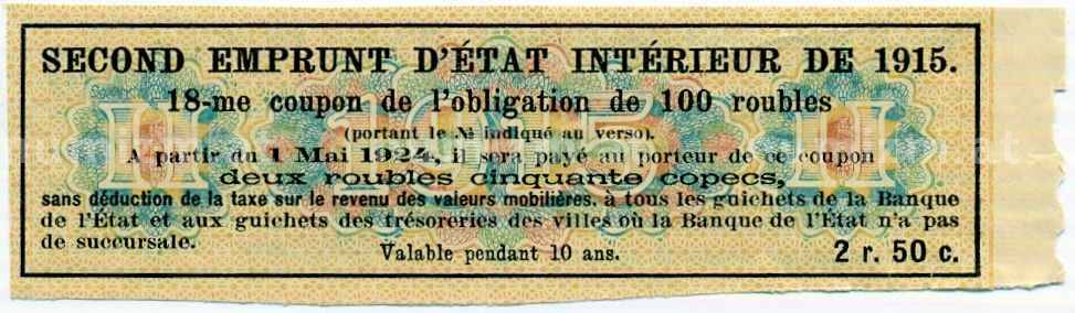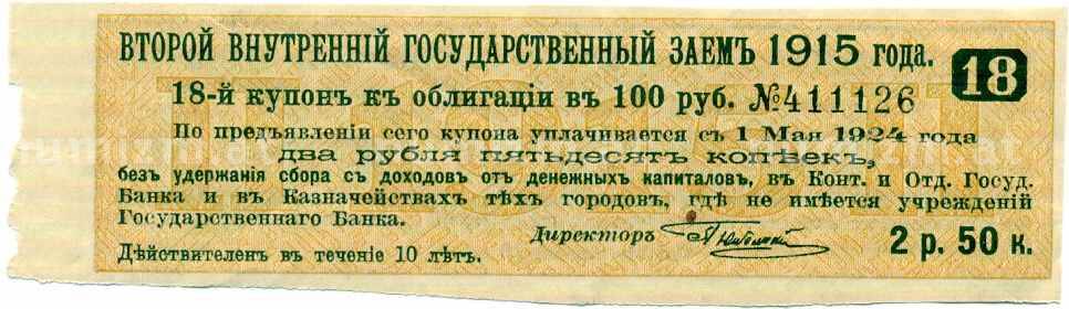 Купон от облигации 100 рублей 1915 года «Второй внутренний государственный заем» (Артикул: T11-26895): подробные характеристики, качественные фотографии в высоком разрешении, низкая цена.