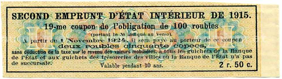 Купон от облигации 100 рублей 1915 года «Второй внутренний государственный заем» (Артикул: T11-26898): подробные характеристики, качественные фотографии в высоком разрешении, низкая цена.