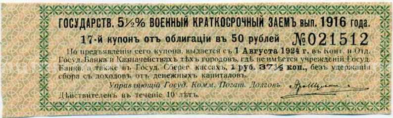Купон от облигации 50 рублей 1916 года «Государственный военный краткосрочный заем» (Артикул: T11-26903): подробные характеристики, качественные фотографии в высоком разрешении, низкая цена.