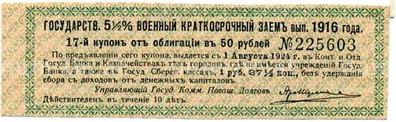 Купон от облигации 50 рублей 1916 года «Государственный военный краткосрочный заем» (Артикул: T11-26906): подробные характеристики, качественные фотографии в высоком разрешении, низкая цена.