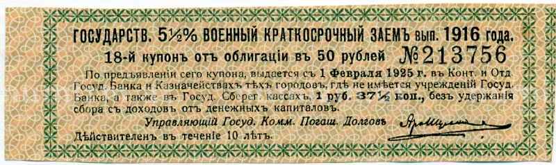Купон от облигации 50 рублей 1916 года «Государственный военный краткосрочный заем» (Артикул: T11-26907): подробные характеристики, качественные фотографии в высоком разрешении, низкая цена.