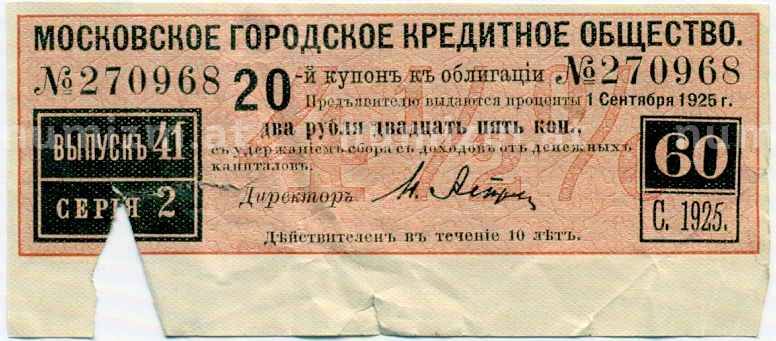 20.01.2025Интернет магазин «Нумизмат» предлагает приобрести Купон от облигации 100 рублей 1915 года «Московское городское кредитное общество».