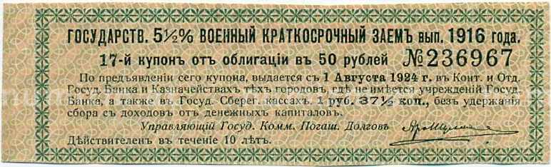 Купон от облигации 50 рублей 1916 года «Государственный военный краткосрочный заем» (Артикул: T11-26932): подробные характеристики, качественные фотографии в высоком разрешении, низкая цена.