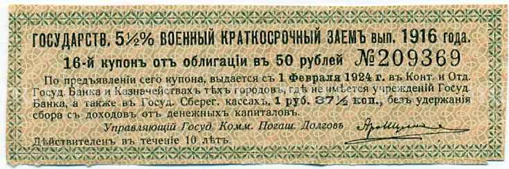 20.01.2025Интернет магазин «Нумизмат» предлагает приобрести Купон от облигации 50 рублей 1916 года «Государственный военный краткосрочный заем».