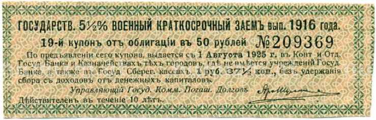 Купон от облигации 50 рублей 1916 года «Государственный военный краткосрочный заем» (Артикул: T11-26942): подробные характеристики, качественные фотографии в высоком разрешении, низкая цена.