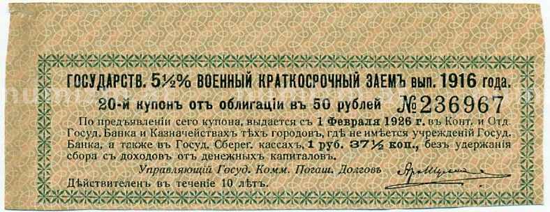 Купон от облигации 50 рублей 1916 года «Государственный военный краткосрочный заем» (Артикул: T11-26943): подробные характеристики, качественные фотографии в высоком разрешении, низкая цена.