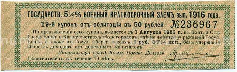 Купон от облигации 50 рублей 1916 года «Государственный военный краткосрочный заем» (Артикул: T11-26944): подробные характеристики, качественные фотографии в высоком разрешении, низкая цена.