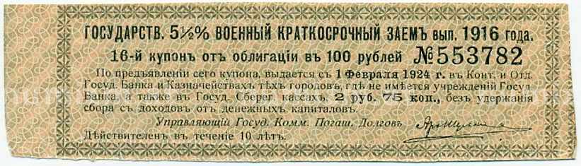 Купон от облигации 100 рублей 1916 года «Государственный военный краткосрочный заем» (Артикул: T11-26947): подробные характеристики, качественные фотографии в высоком разрешении, низкая цена.
