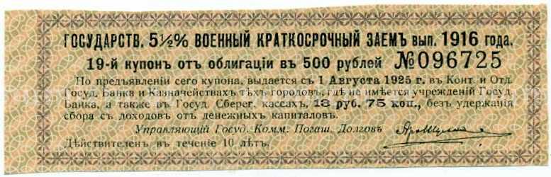 Купить Купон от облигации 500 рублей 1916 года «Государственный военный краткосрочный заем» по привлекательной цене можно в нашем интернет-магазине — Вам достаточно оформить заказ на сайте. Все монеты, представленные в каталоге, находятся в наличии на нашем складе.