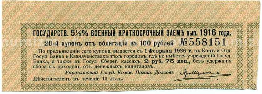Купон от облигации 100 рублей 1916 года «Государственный военный краткосрочный заем» (Артикул: T11-26974): подробные характеристики, качественные фотографии в высоком разрешении, низкая цена.