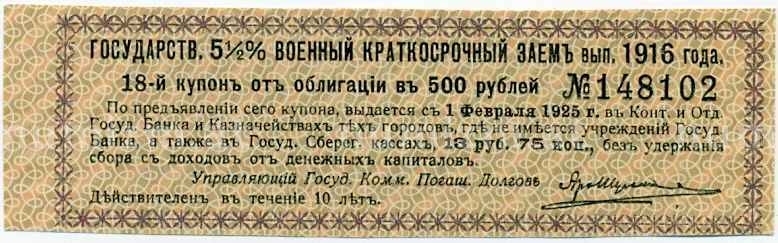 Купон от облигации 500 рублей 1916 года «Государственный военный краткосрочный заем» (Артикул: T11-26975): подробные характеристики, качественные фотографии в высоком разрешении, низкая цена.
