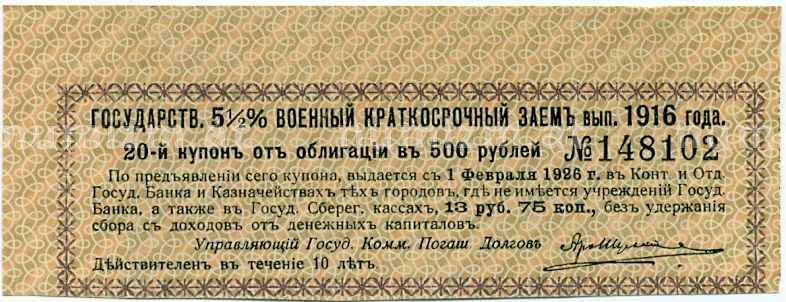 Купон от облигации 500 рублей 1916 года «Государственный военный краткосрочный заем» (Артикул: T11-26977): подробные характеристики, качественные фотографии в высоком разрешении, низкая цена.