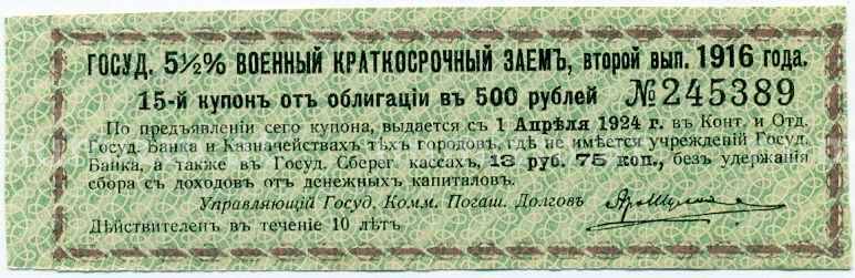 Купон от облигации 500 рублей 1916 года «Государственный военный краткосрочный заем» (Артикул: T11-26983): подробные характеристики, качественные фотографии в высоком разрешении, низкая цена.