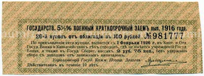 Купон от облигации 100 рублей 1916 года «Государственный военный краткосрочный заем» (Артикул: T11-26992): подробные характеристики, качественные фотографии в высоком разрешении, низкая цена.