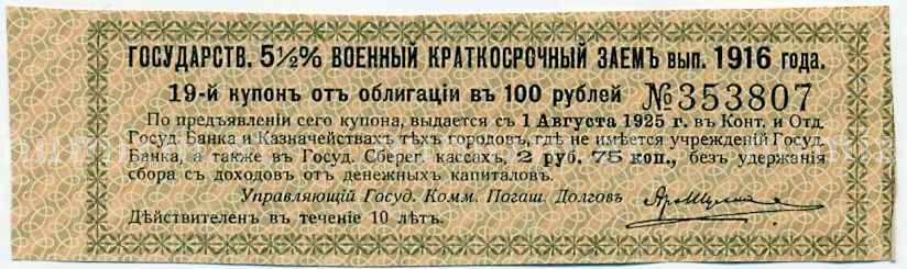 20.01.2025Интернет магазин «Нумизмат» предлагает приобрести Купон от облигации 100 рублей 1916 года «Государственный военный краткосрочный заем».