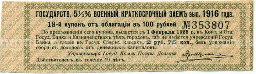 Купить Купон от облигации 100 рублей 1916 года «Государственный военный краткосрочный заем» по привлекательной цене можно в нашем интернет-магазине — Вам достаточно оформить заказ на сайте. Все монеты, представленные в каталоге, находятся в наличии на нашем складе.