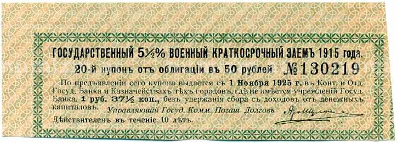 Купон от облигации 50 рублей 1915 года «Государственный военный краткосрочный заем» (Артикул: T11-27005): подробные характеристики, качественные фотографии в высоком разрешении, низкая цена.